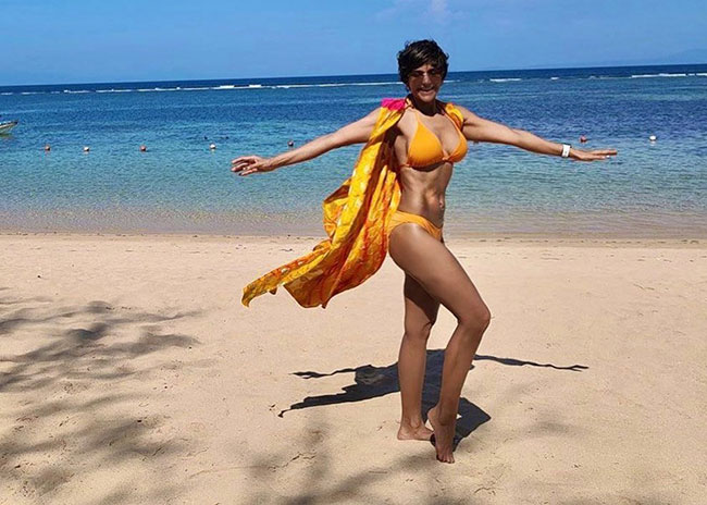 She recently played a key role in ‘Saaho’ and it is safe to say that she never lost her glow and glamour. In her recent beach click too, Mandira slipped into a yellow two-piece bikini where she shows off her steamy assets in the best way possible. Those washboard abs and long legs are sure to make people go weak in their knees.