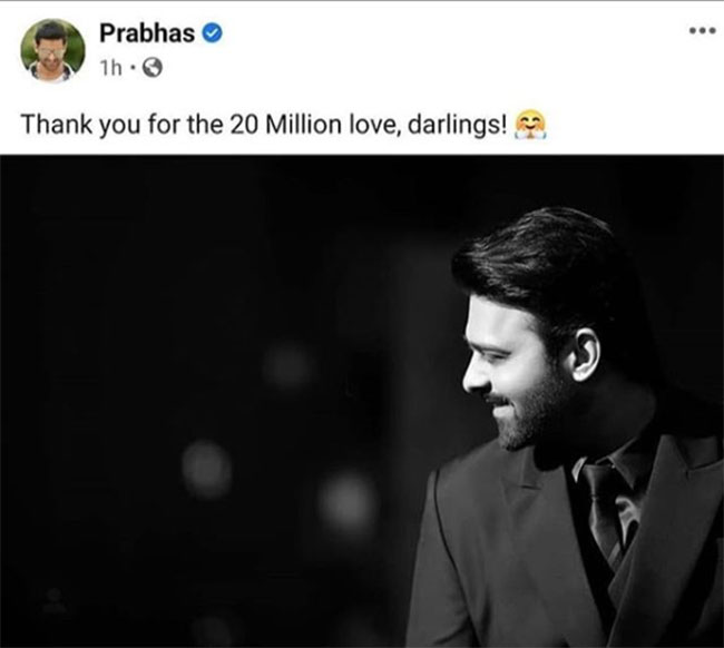 On this note, Prabhas thanked the fans. He wrote on his Facebook page as, “Thank you for the 20 Million love, darlings!”
