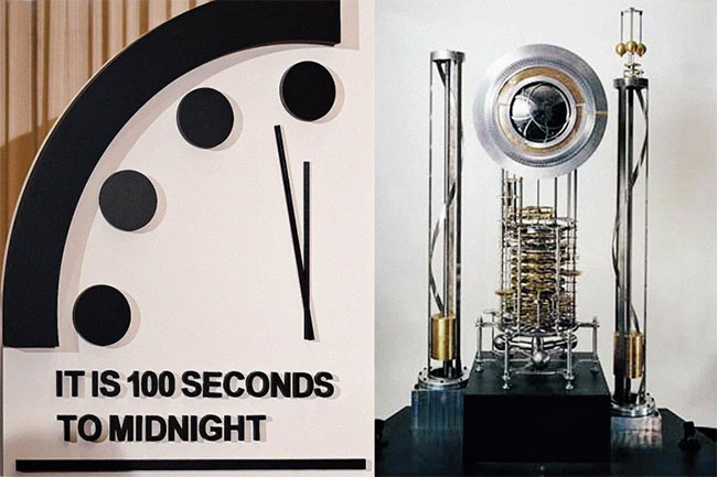 దేశాలు అంతర్జాతీయ సంస్థలు దీనిని ఎదుర్కోవడానికి సిద్ధం కాలేదు అని ఆయన అభిప్రాయపడ్డారు. గతేడాది మిడ్ నైట్ కు 2 నిమిషాల దూరంలో ఉన్న ఈ క్లాక్.. ఇప్పుడు 100 సెకన్లకు చేరింది. ఇదిలా ఉంటే అసలు డూమ్స్ డే క్లాక్ ఏమిటి..ఇది అర్ధరాత్రికి చేరువ కావడం ఏంటి అన్న ప్రశ్నలు తలెత్తడం సహజం. అసలు ఈ గడియారం ఏంటో ఇప్పుడు చూద్దాం. ఈ క్లాక్ ను 1947లో ఆల్బర్ట్ ఐన్ స్టీన్ షికాగో యూనివర్సిటీ విద్యార్థులు కలిసి స్థాపించిన బులెటిన్ ఆఫ్ ద అటామిక్ సైంటిస్ట్స్ అభివృద్ధి చేసింది. ఈ బోర్డులో 13 మంది నోబెల్ గ్రహీతలు ఉన్నారు. ప్రపంచం అంతమవడానికి ఎంత దగ్గరలో ఉందో చెప్పేందుకు ఈ గడియారాన్ని నిదర్శనంగా చెబుతారు. మానవాళి ఎదుర్కొంటున్న సవాళ్లకు అనుగుణంగా ఈ గడియారాన్ని సవరిస్తూ ఉంటారు.