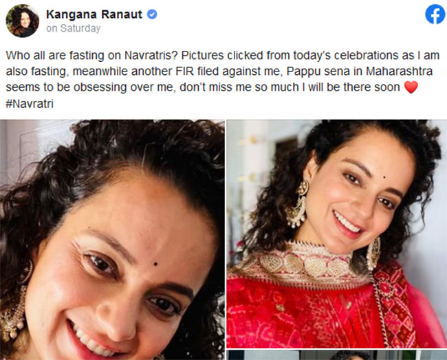దేవీ నవరాత్రుల వృతాచరణలో భాగంగా ఎరుపు సాంప్రదాయ దుస్తులలో ధరించిన కంగన వాటిలో కొన్ని చిత్రాలను పంచుకుంది. వాటికి ఒక శీర్షికను జతచేసింది… “నవరాత్రిలో ఎవరు ఉపవాసం ఉన్నారు? నేటి వేడుకల నుండి పిక్చర్స్ క్లిక్ చేశాను. నేను కూడా ఉపవాసంలో ఉన్నాను. అదే సమయంలో నాపై మరొక ఎఫ్.ఐ.ఆర్ దాఖలు చేశారు. మహారాష్ట్రలోని పప్పు సేన నాపై మక్కువతో ఉన్నట్లు అనిపిస్తుంది. నన్ను మిస్ చేసుకోవద్దు ప్లీజ్.. నేను త్వరలో అక్కడకు వస్తాను” అంటూ వ్యాఖ్యానించింది. వ్యాఖ్యల విభాగంలో నవరాత్రి శుభాకాంక్షలతో ఆమె అభిమానులకు టచ్ లోకి వెళ్లారు. మరికొందరు కూడా కంగనపై ద్వేషపూరిత వ్యాఖ్యలను పోస్ట్ చేయడం సోషల్ మీడియాల్లో బయటపడింది.