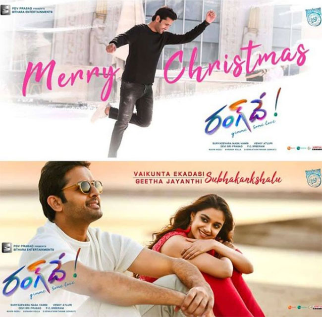 నితిన్ కీర్తి సురేష్ హీరోహీరోయిన్లుగా వెంకీ అట్లూరి తెరకెక్కిస్తోన్న లవ్ ఎంటర్టైనర్ ‘రంగ్ దే’. లాక్డౌన్ తర్వాత షూటింగ్లు తిరిగి ప్రారంభం కావడంతో.. ఈ మూవీ కూడా సెట్స్ కి వెళ్లింది. ప్రస్తుతం ‘రంగ్ దే’ మూవీ షూటింగ్ చివరి దశలో ఉందని సమాచారం. సితార ఎంటర్ టైన్ మెంట్స్ ఈ చిత్రాన్ని నిర్మిస్తోంది. అయితే.. శుక్రవారం క్రిస్మస్ వైకుంఠ ఏకాదశి సందర్భాన్ని పురస్కరించుకొని చిత్ర బృందం ప్రేక్షకులకు శుభాకాంక్షలు తెలుపుతూ “రంగ్ దే” పోస్టర్లను ఫోటోలను విడుదల చేసింది. ఈ ఫోటోల్లో వైట్ టీషర్ట్ లో గాగుల్స్ పెట్టుకొని నితిన్ స్మైల్ ఇస్తుంటే.. అతన్నే తదేకంగా చూస్తున్న కీర్తి సురేష్ రెడ్ డ్రెస్ లో ఫుల్లుగా మెరిసిపోతోంది. ఈ చిత్రాలు సోషల్ మీడియాలో వైరల్ అయ్యాయి.